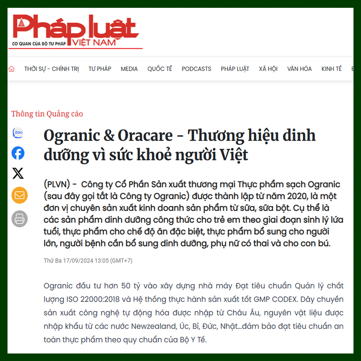 (VNF) – Công ty Cổ Phần Sản xuất thương mại Thực phẩm sạch Ogranic (Công ty Ogranic) được thành lập từ năm 2020, là một đơn vị chuyên sản xuất kinh doanh sản phẩm từ sữa, sữa bột, cụ thể là các sản phẩm dinh dưỡng công thức cho trẻ em theo giai đoạn sinh lý lứa tuổi, thực phẩm cho chế độ ăn đặc biệt, thực phẩm bổ sung cho người lớn, người bệnh cần bổ sung dinh dưỡng, phụ nữ có thai và cho con bú.